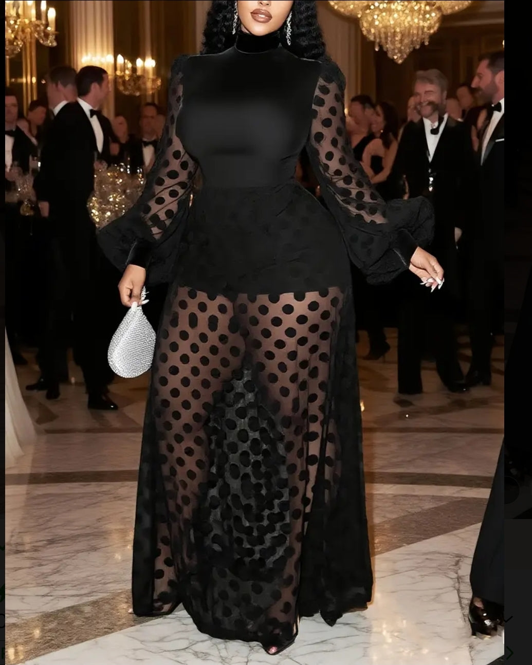 Elegant Women'S Casual Half-High Collar Polka Dot Mesh Spliced Fitted Long Sleeve Dress