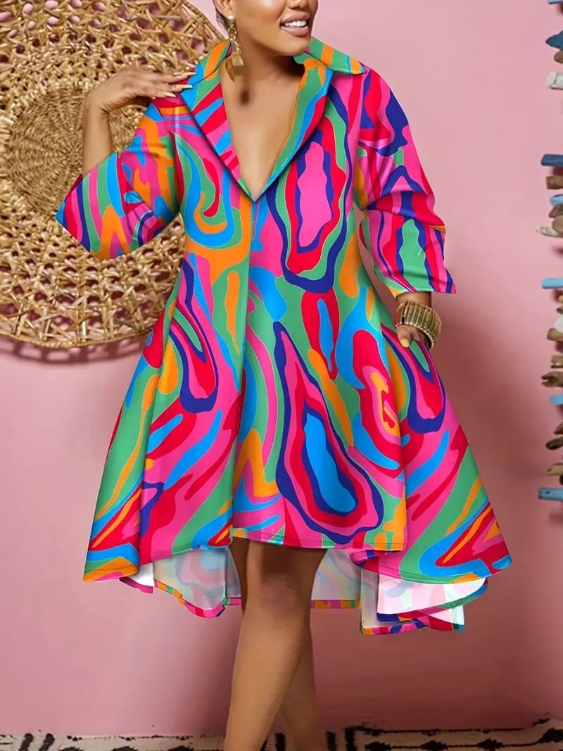 Plus Size Women's Allover Print Long Sleeve Polo Neck Slight Stretch Casual Dress - Comfortable, Relaxed Fit, Soft Fabric, Versatile, Easy to Wear - Perfect for Daily Life, Work, or Leisure Activities