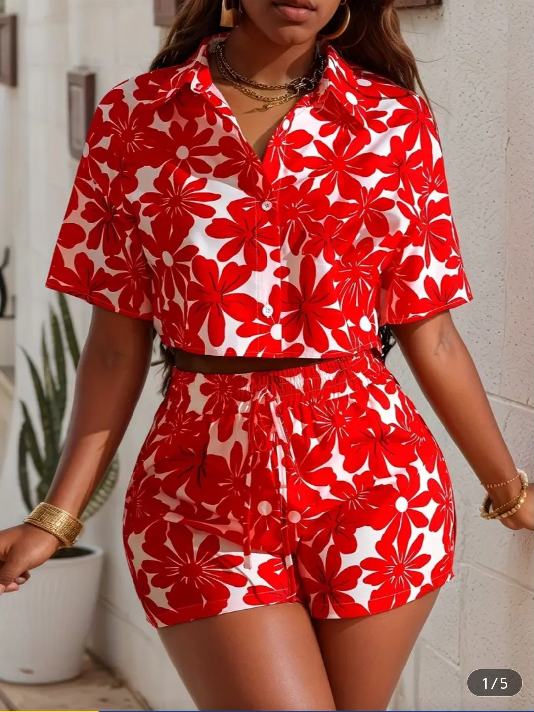 2025 Vacation Style Printed Short Sleeve Shirt + Shorts Two-Piece Set for Women