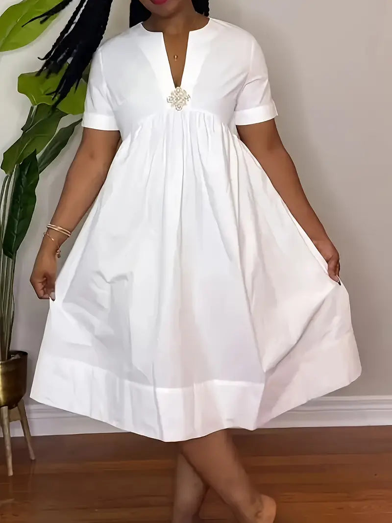 Plus Size, Women's Elegant V-Neck Short Sleeve A-Line Shirt Dress - Bright Yellow with Waist-Cinching Detail, Loose Fit Machine Washable All-Season Casual Vacation & Casual Attire, Short Sleeve Dress, Versatile Clothing, Chic Style, Durable Clothing, Summer Fashion