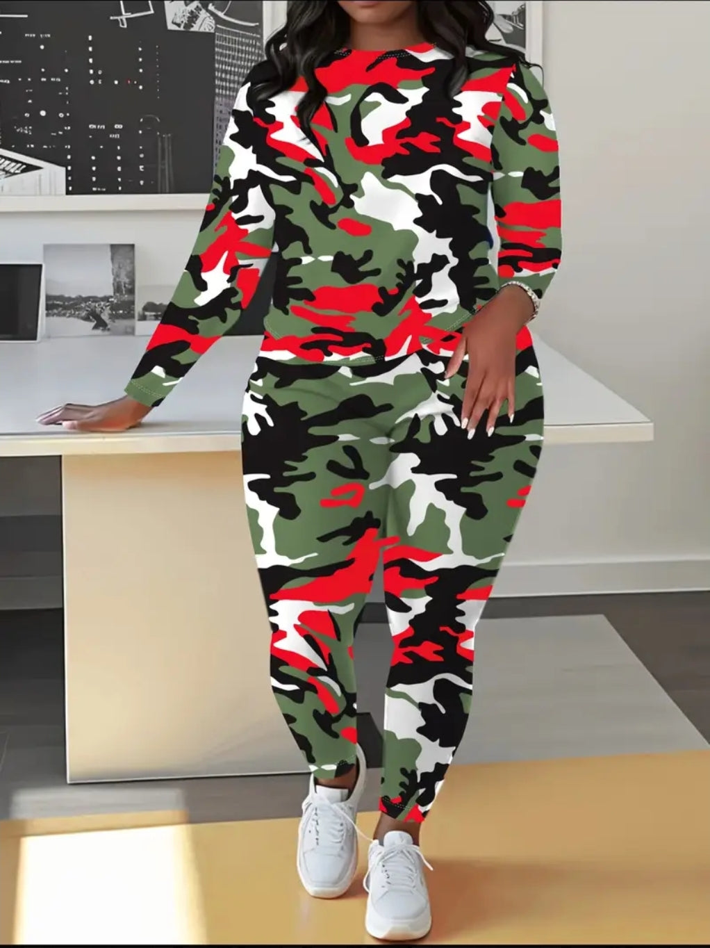 Plus Size Women's Camouflage Long Sleeve Tracksuit Set - Full-Body Print Crew Neck Long Sleeve T-shirt & Sports Pants