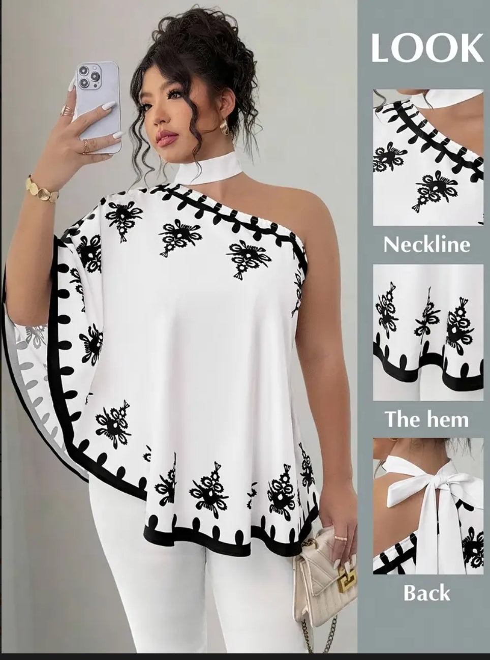 Plus Size - Plus Size - Elegant Plus Size Women'S Printed Shirt | Asymmetrical Neck, Lace-up Detail, Non-Stretch Fabric, Suitable for Spring/Summer/Fall