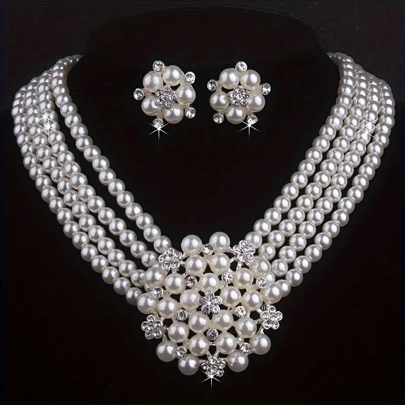 High end and atmospheric flower necklace with a pair of earrings set in milky white, 4-row bead necklace, wedding banquet, evening party, engagement set chain