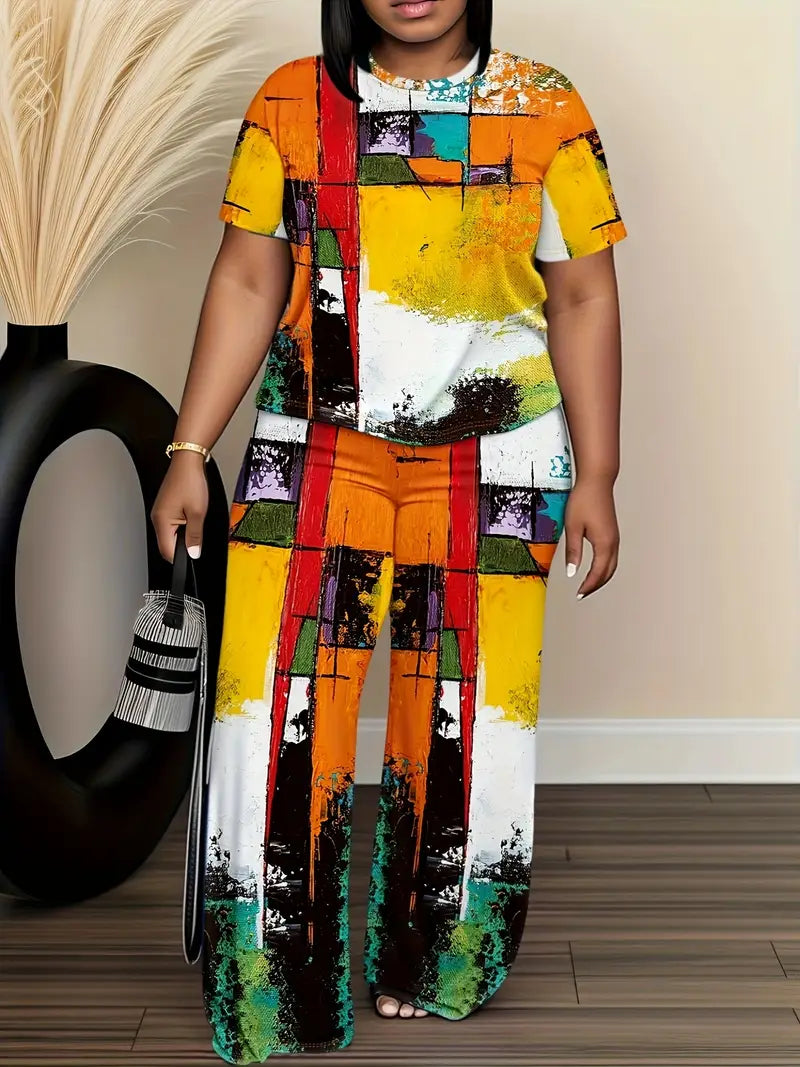 Plus Size, Plus Size Loose Fit Set, Colorful Multi-Color Print. Short Sleeve Top and Long Pants Casual Outfit