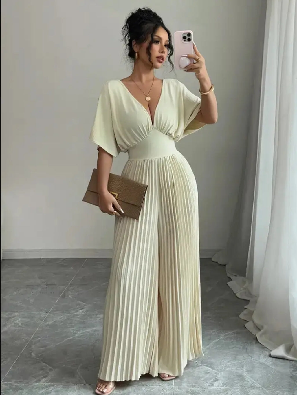 Elegant Jumpsuit for Women Elegant Deep V-Neck Batwing Pleated Jumpsuit for Women | Solid Color Beige, Wide-Leg Design, Cinched Waist, Perfect for Spring/Summer, Casual to Formal Wear, Ribbed Texture