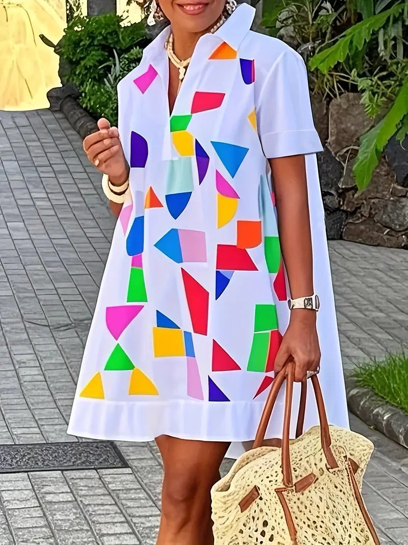Color Block Print Women's Plus Size Short Sleeve Lapel Collar Dress - 100% Polyester Casual Urban Summer Dress with Contrast Color Design, Machine Washable