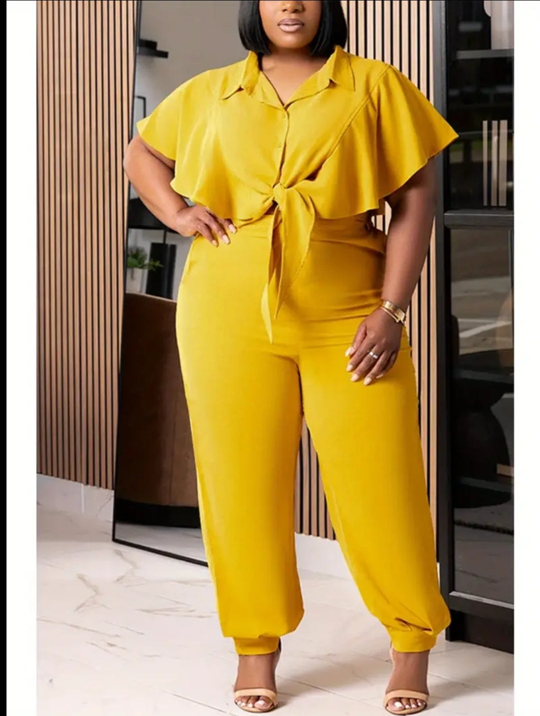 Plus Size, Plus size autumn Women's solid color plus size solid color lace short-sleeved top and pants set