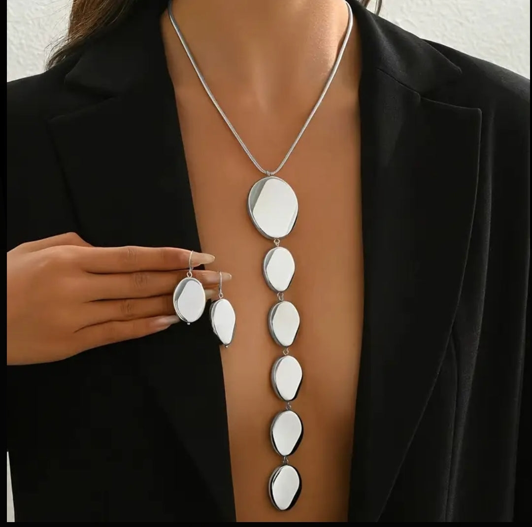 A Trendy And Minimalist Y-Shaped Necklace Featuring a Combination of Metal Oval Pieces And Beaded Strands, Along with Geometric Oval Drop Earrings, Suitable for Everyday Wear, Parties, And Banquets